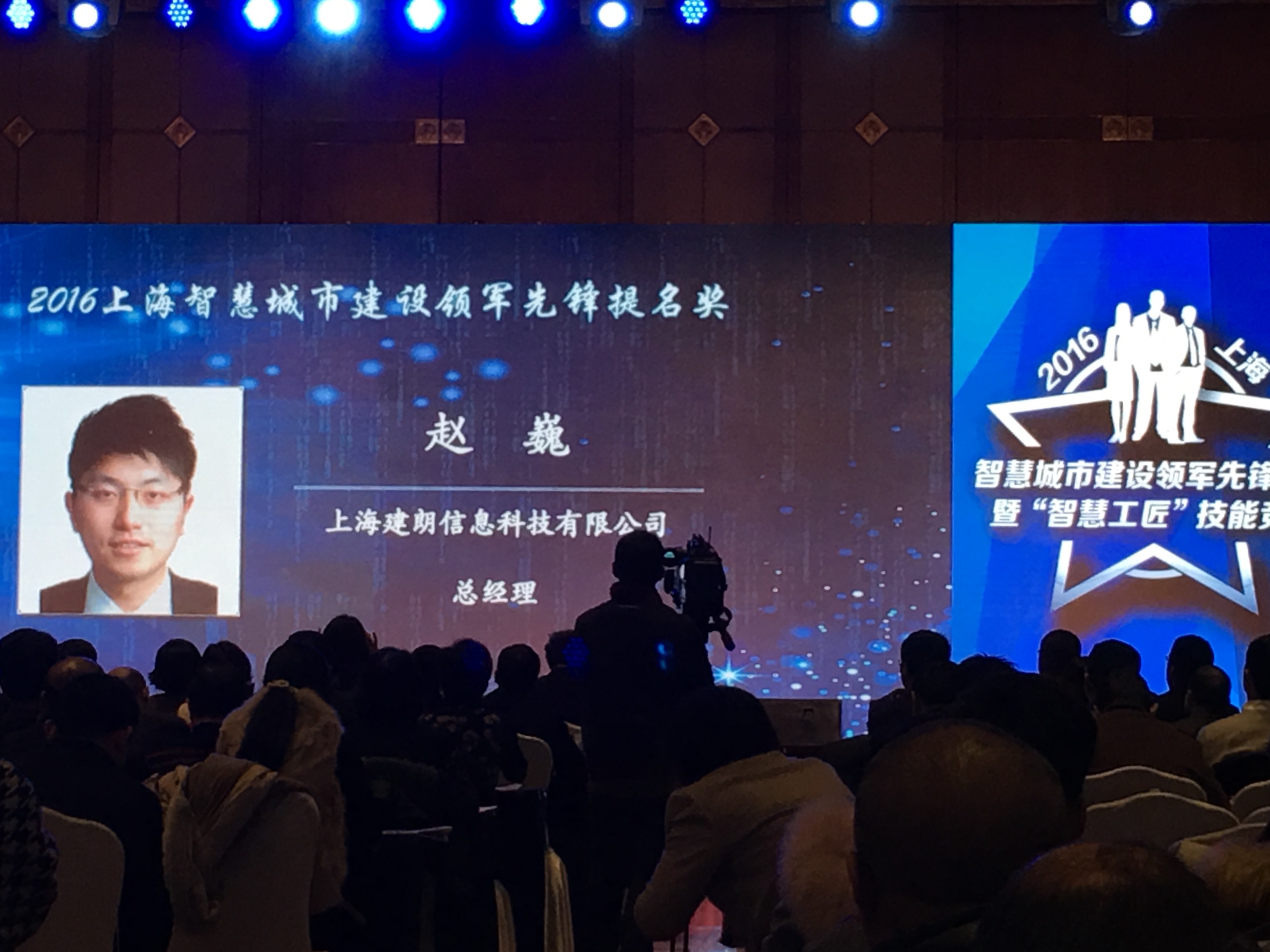 上海建朗信息科技有限公司總經(jīng)理趙巍,榮獲2016上海智慧城市建設(shè)領(lǐng)軍先鋒評(píng)選暨“智慧工匠”技能競賽——2016上海智慧城市建設(shè)領(lǐng)軍先鋒提名獎(jiǎng)!