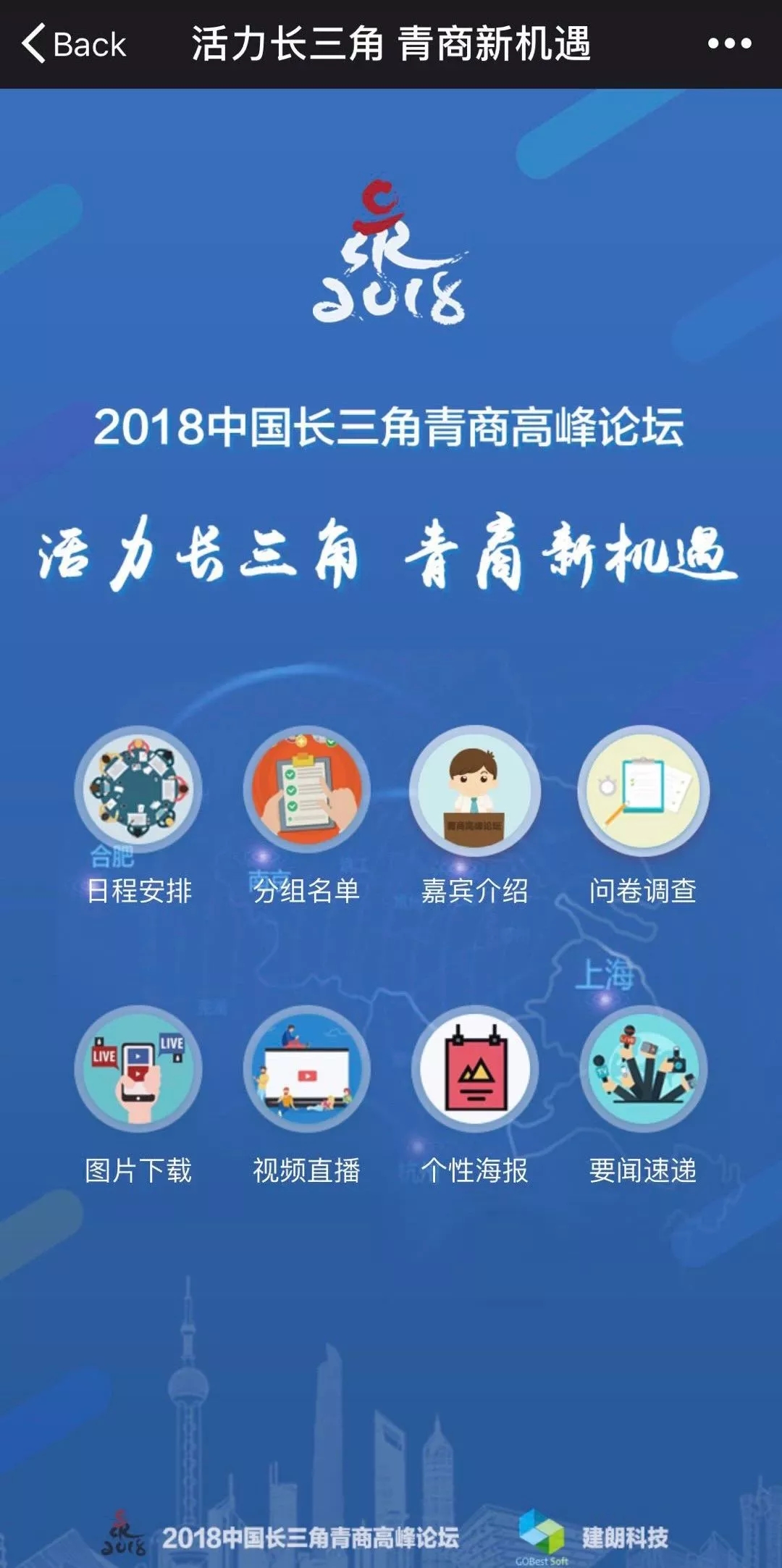 上海建朗信息科技有限公司設(shè)計(jì)制作“活力長三角,青商新機(jī)遇”2018中國長三角青商高峰論壇H5頁面。