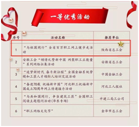 其中,由陜西省總工會(huì)主辦、上海建朗信息科技有限公司提供技術(shù)支持的“與祖國(guó)同行”全省百萬職工網(wǎng)上健步走活動(dòng)榮獲“一等優(yōu)秀活動(dòng)”!