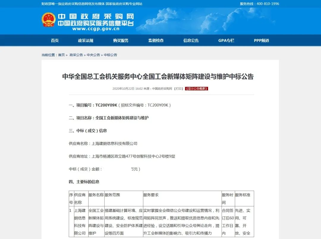 10月22日,建朗科技中標中華全國總工會《全國工會新媒體矩陣建設與維護》項目,此次中標是繼2018年服務全總中國工會第十七次全國代表大會項目后,開啟的新一輪合作。